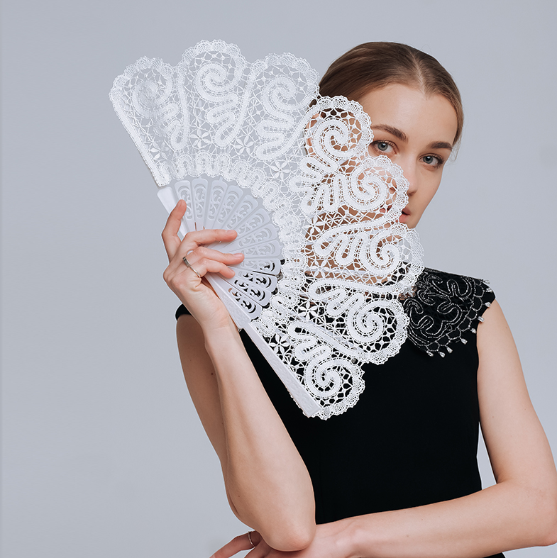 Самый дамский аксессуар - кружевной веер. Витиеватый узор привлекает внимание знатоков тайных переговоров... Без слов всё станет понятно, лишь взмахнуть крылом изящного веера...